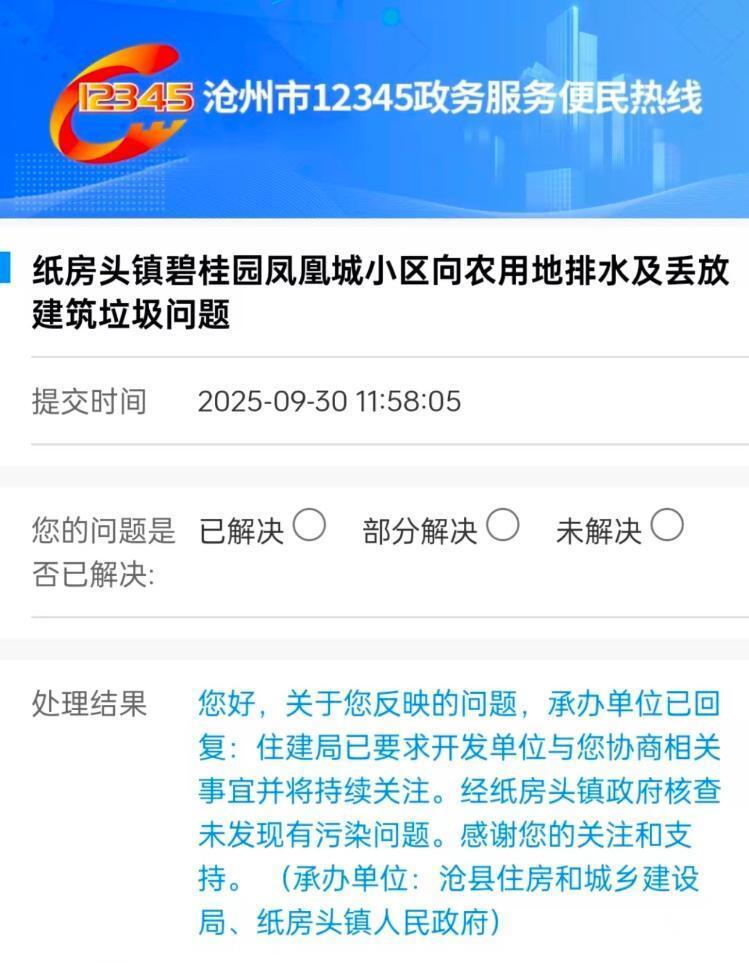 记者从何先生提供的资料中看到,其于此前向沧州市12345政务服务便民热线反映了碧桂园凤凰城小区向农用地排水的问题。承办单位沧县住建局、纸房头镇人民政府回复称,“住建局已要求开发单位与您协商相关事宜并将持续关注。经纸房头镇政府核查未发现有污染问题。”此外,承办单位纸房头镇方面表示,“纸房头镇政府将积极搭建沟通平台,与您、碧桂园施工方深入对接磋商,推动问题妥善解决。”