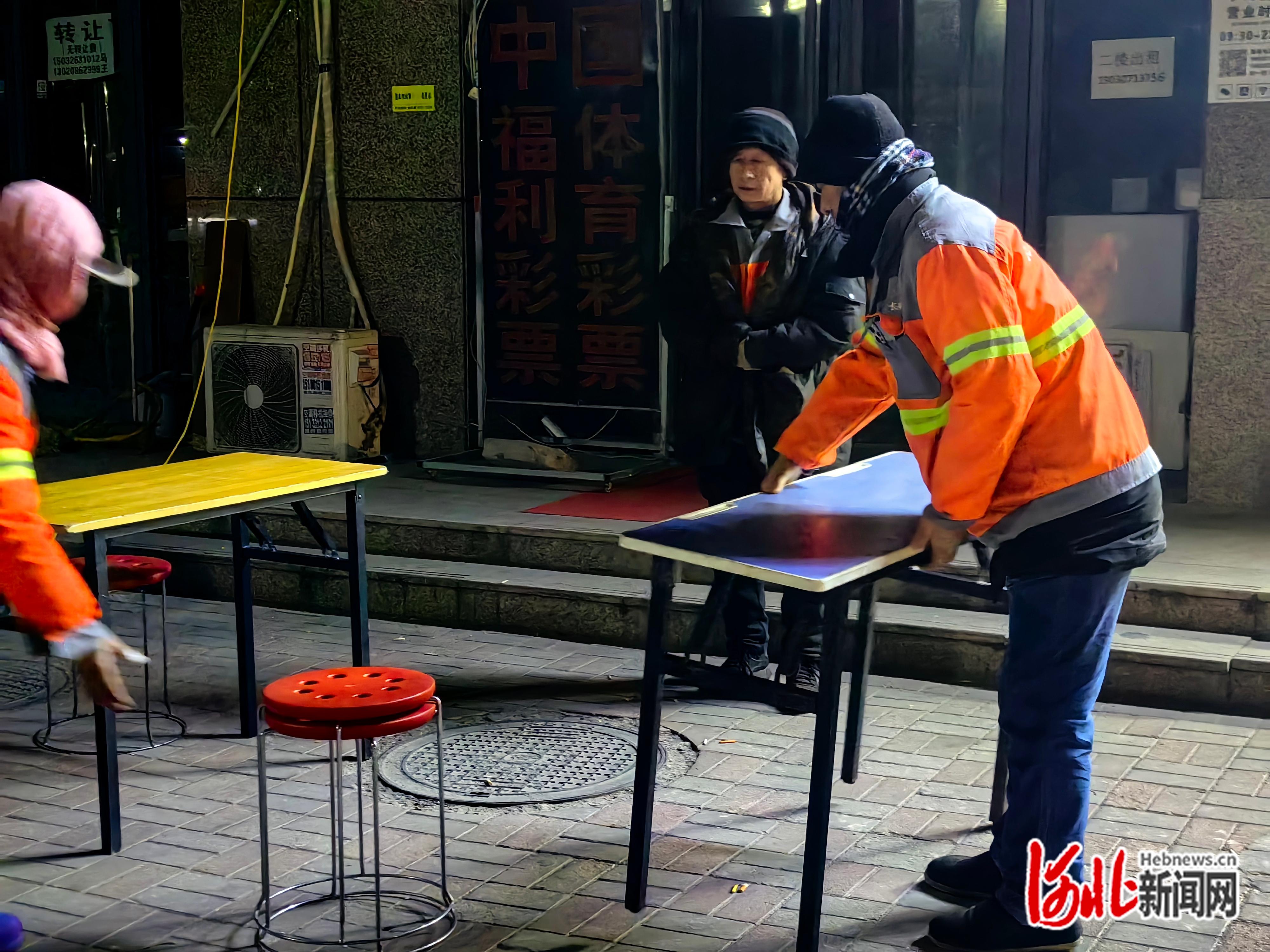环卫工们在帮忙搬桌子。(袁欣悦/摄)