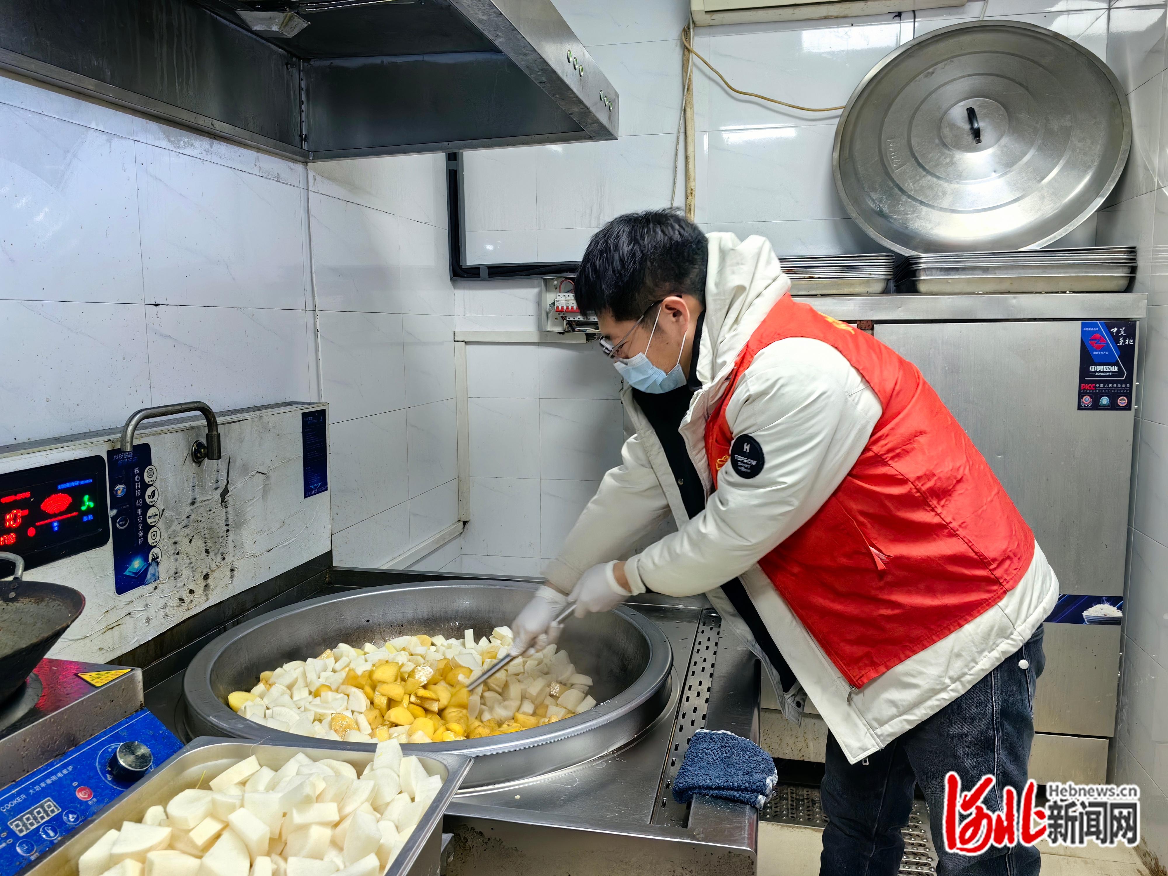 当大多数人还沉浸在梦乡时,众爱餐厅的厨房早已热闹起来。4名身着红色马甲的志愿者戴好口罩和塑胶手套,各司其职地投入备餐工作。削土豆、切白菜、热馒头、熬米粥,动作娴熟又麻利。不一会儿,炖菜的香气便在餐厅里弥漫开来。“我们会根据季节变化和食材库存调整菜单,保证营养均衡又合大家口味。”志愿者吕晓燕笑着说,每逢初一十五或传统节日,还会特意改善伙食,包上顿热腾腾的饺子,让大家尝到家的味道。